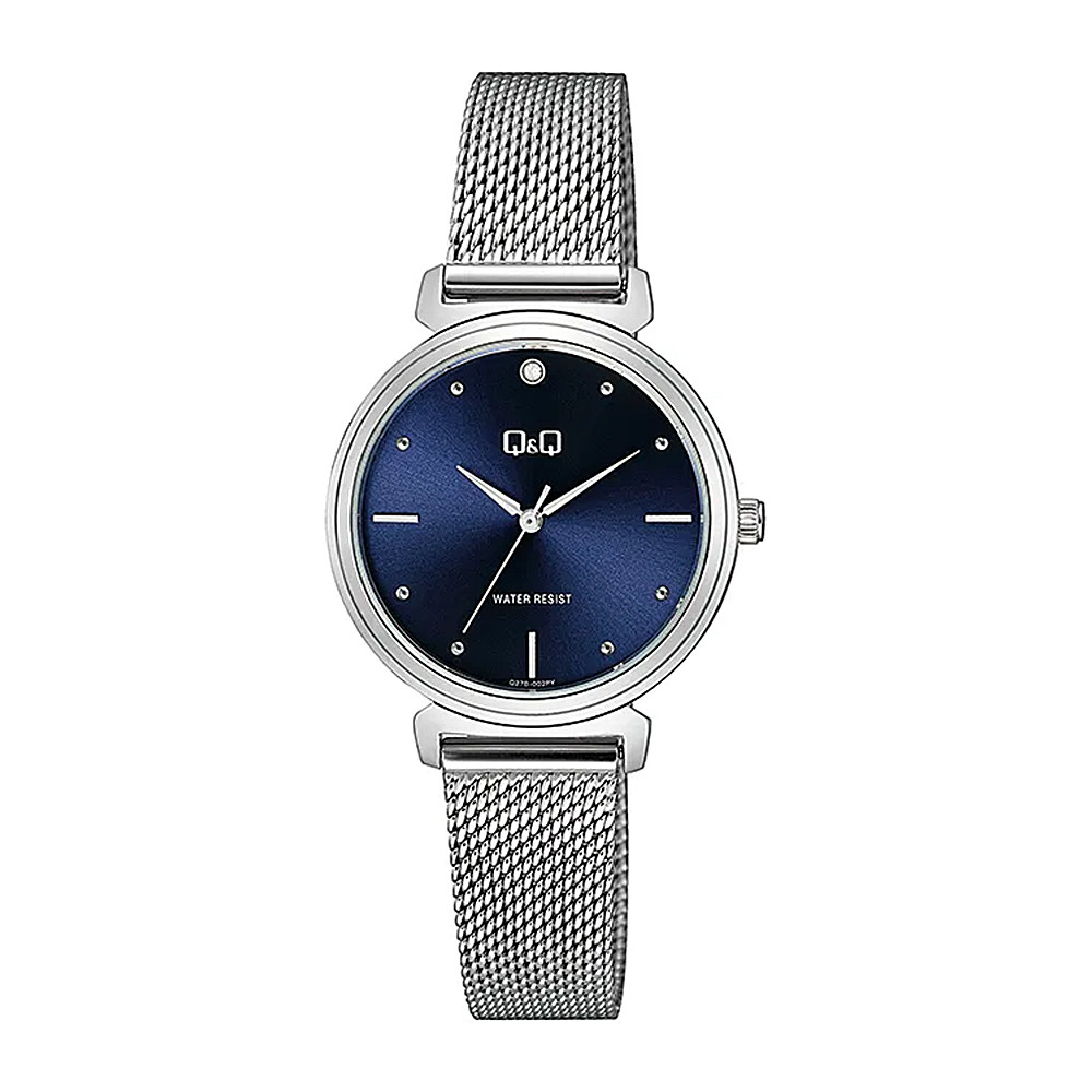 Q&Q női karóra, ezüst színű fémtok, ezüst színű nemesacél csat (mesh band), kék számlap, Q27B-002PY
