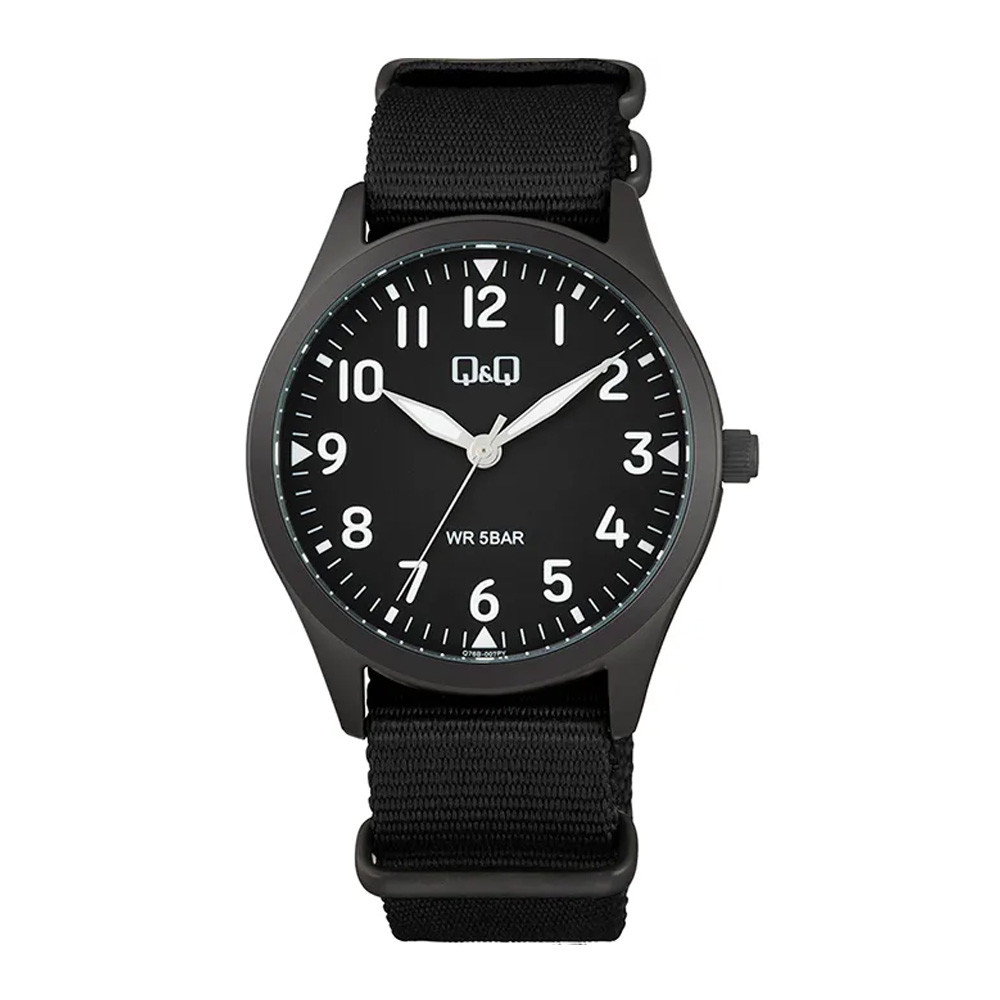 Q&Q férfi karóra, fekete színű fémtok, fekete színű számlap, fekete színű NATO szíj Q76B-007PY