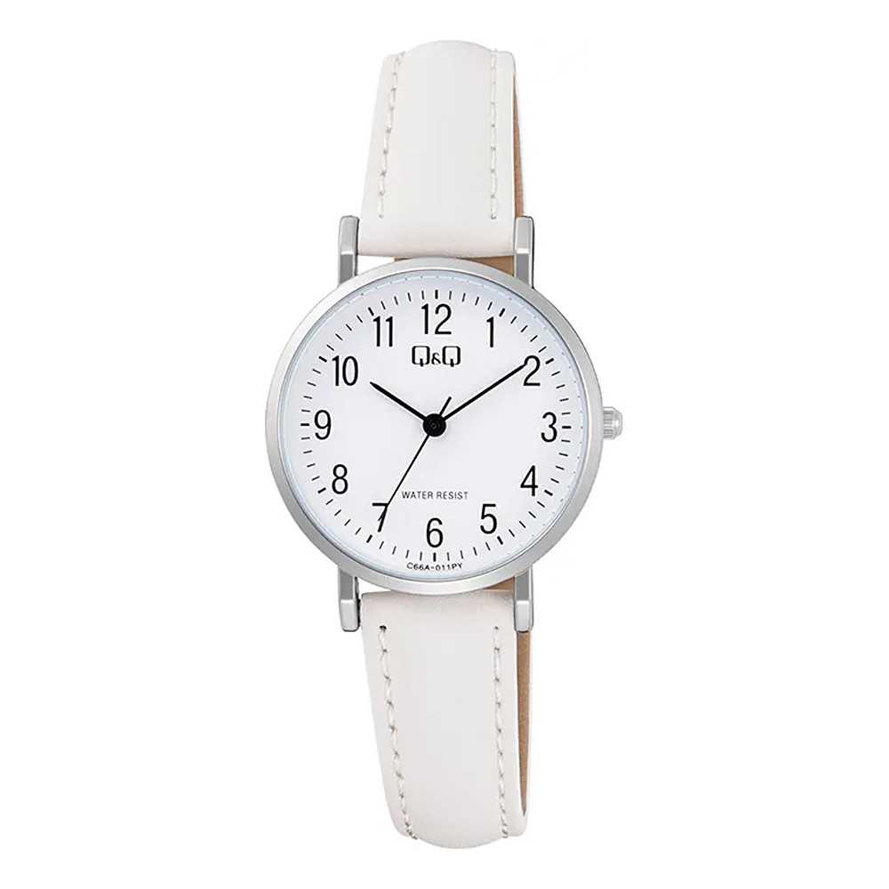 Q&Q női karóra, quartz, ezüst színű fémtok, fehér színű számlap, fehér színű bőrszíj C66A-011PY