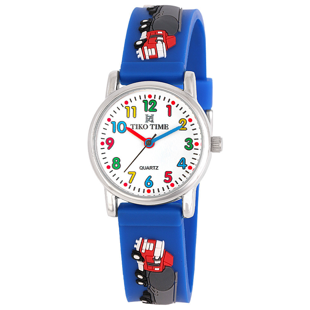 Tiko Time karóra gyerekeknek, ezüst színű fémtok, quartz szerkezet, fehér arab színű számlap, 3D figurás kék színű műanyag szíj, cseppmentes vízállóság (kamionos)