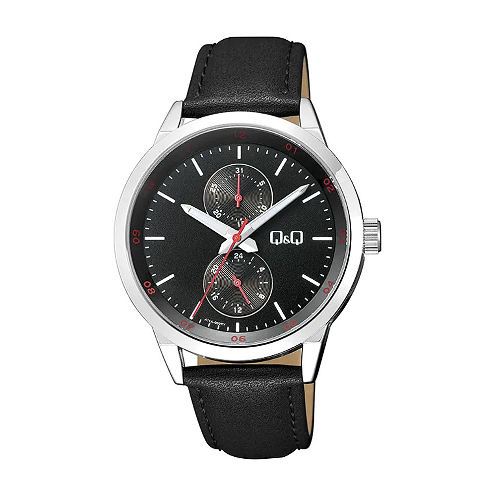 Q&Q férfi karóra, quartz, ezüst színű fémtok, fekete színű bőrszíj, fekete színű számlap, A11A-002PY