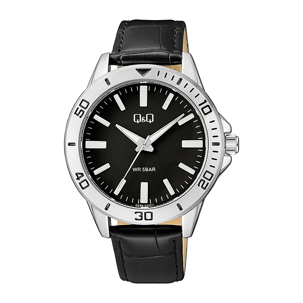 Q&Q férfi karóra, quartz, ezüst színű fémtok, fekete színű bőrszíj, fekete színű számlap, Q28B-006PY