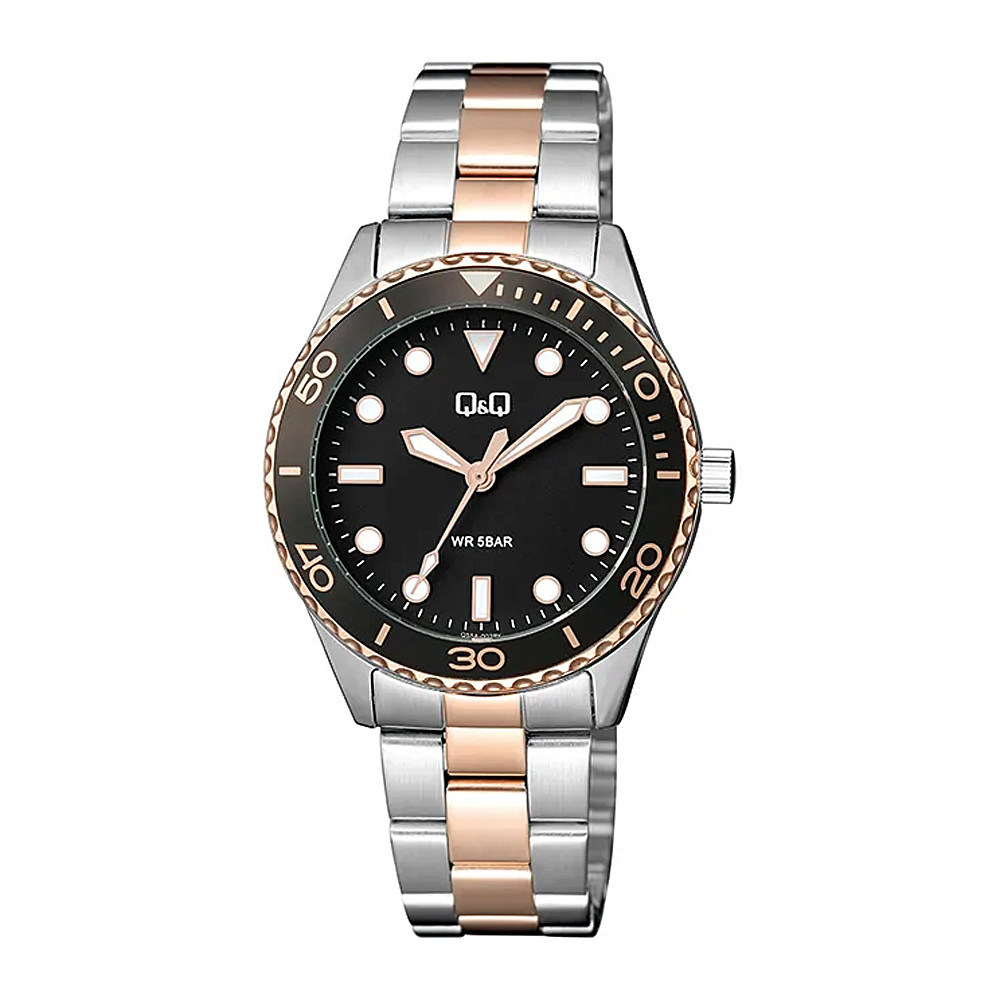 Q&Q női karóra, quartz, bicolor színű fémtok, bicolor színű nemesacél csat, fekete számlap, Q55A-002PY