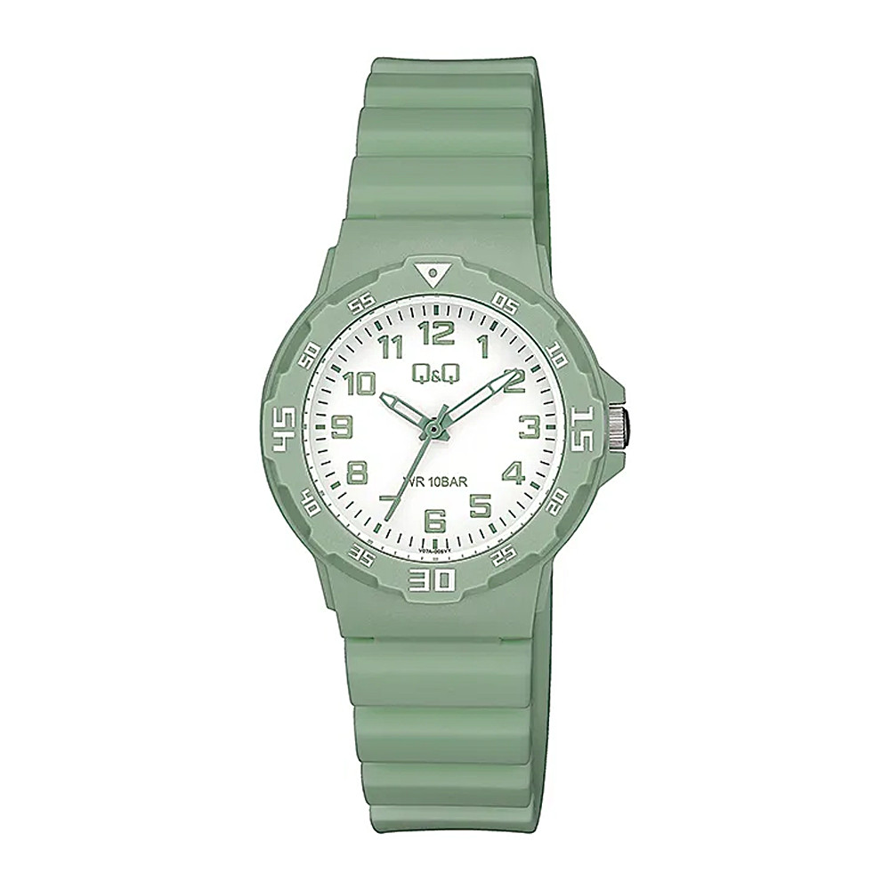 A Q&Q V07A-005VY gyerek karóra játékos, mégis praktikus kiegészítő, amely kifejezetten a mindennapi gyerekhasználatra készült. Könnyű, zöld műanyag tokja és a hozzá illő zöld műanyag szíj kényelmes viseletet biztosít, így a gyerekek szinte észre sem veszik a csuklójukon. A műanyag konstrukció előnye, hogy nem nehezedik el a kézen, és a mindennapi igénybevételt is jól viseli.