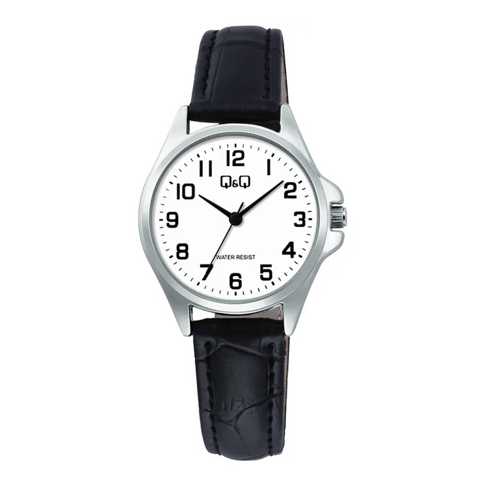 Q&Q női karóra, ezüst színű fémtok, fehér színű számlap, fekete színű bőrszíj C37A-013PY