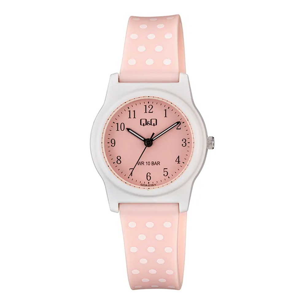 Q&Q karóra, quartz, fehér színű műanyag tok, rózsaszín színű számlap, rózsaszín műanyag szíj, G23A-018VY