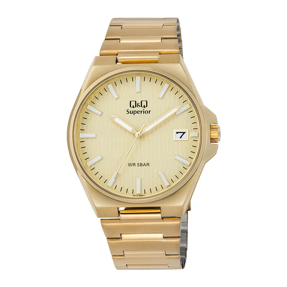 Q&Q Superior Férfi Karóra – Arany Színű Fémtokkal, Texturált Számlappal és Dátumkijelzővel
