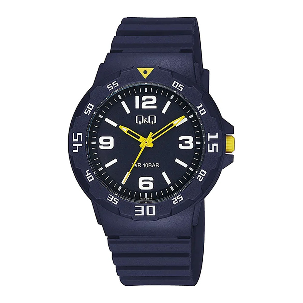 Q&Q Sportos Férfi Karóra – Sötétkék Műanyag Tokkal, Sárga Részletekkel és 10 Bar Vízállósággal