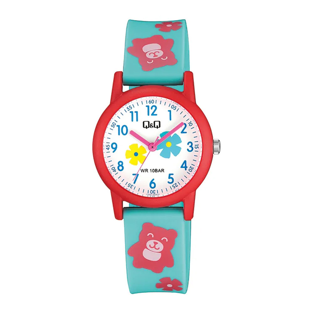 A Q&Q V23A-003VY gyerek karóra játékos megjelenésével és praktikus kialakításával ideális választás az első karórára vágyó gyerekeknek. A figurás számlap segíti az idő leolvasásának megtanulását, miközben színes, vidám megjelenést kölcsönöz az órának.