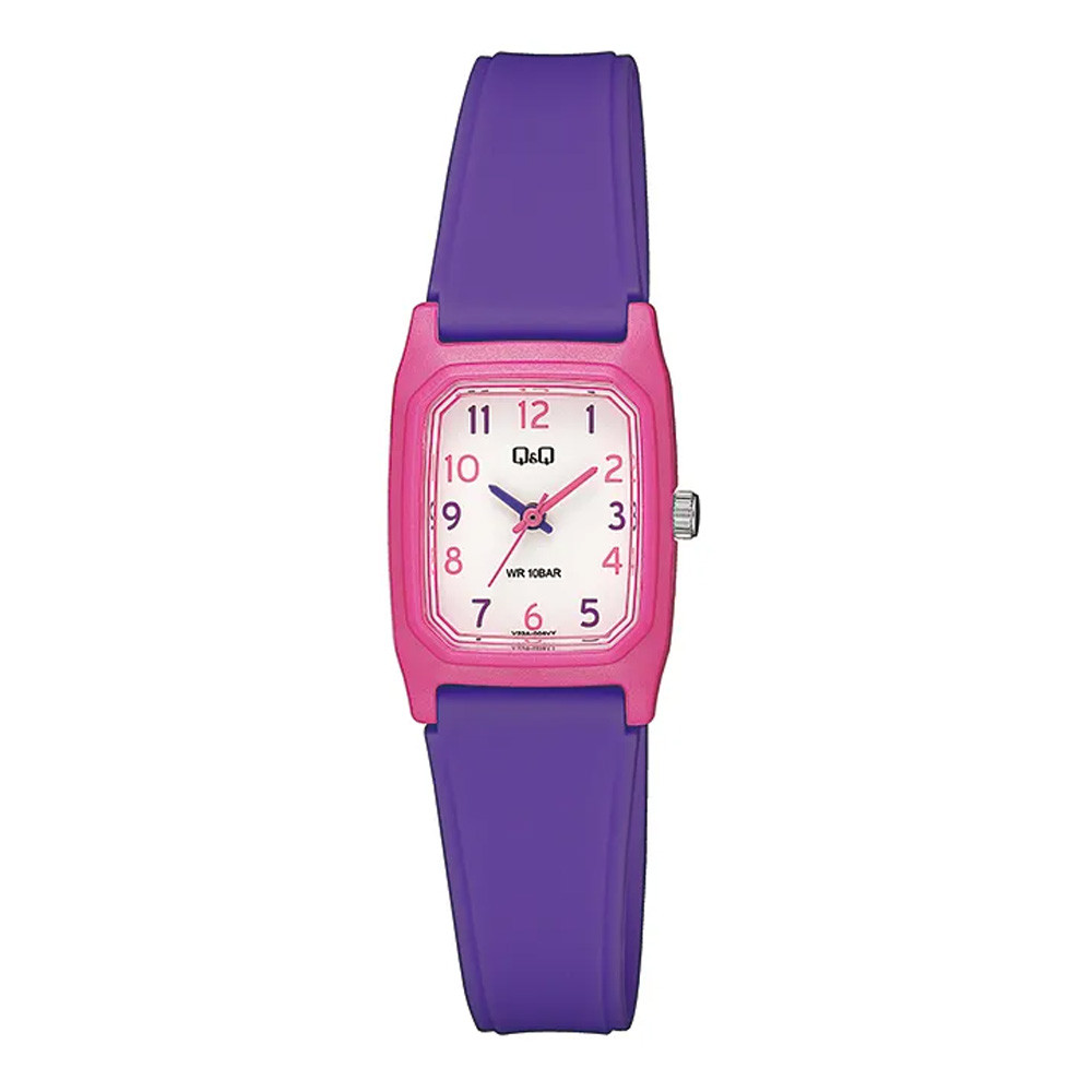 Q&Q karóra, quartz, ciklámen színű műanyag tok, fehér színű számlap, lila műanyag szíj, V33A-004VY