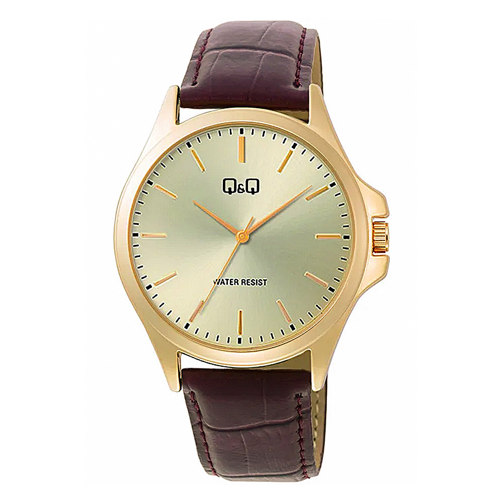 Q&Q Klasszikus Férfi Karóra – Arany Színű Fémtokkal, Arany Számlappal és Barna Bőrszíjjal