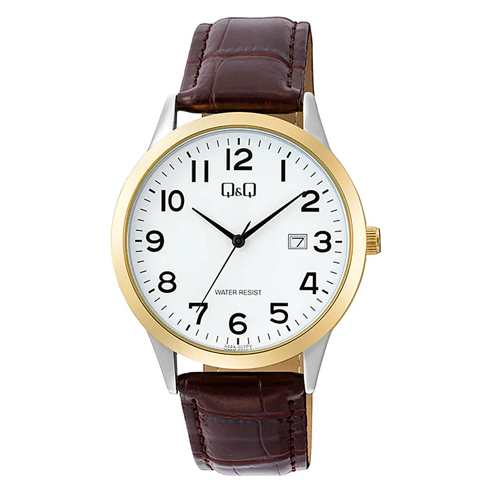 Q&Q férfi karóra, quartz, bicolor színű fémtok, fehér számlap, barna színű bőrszíj A44A-007PY