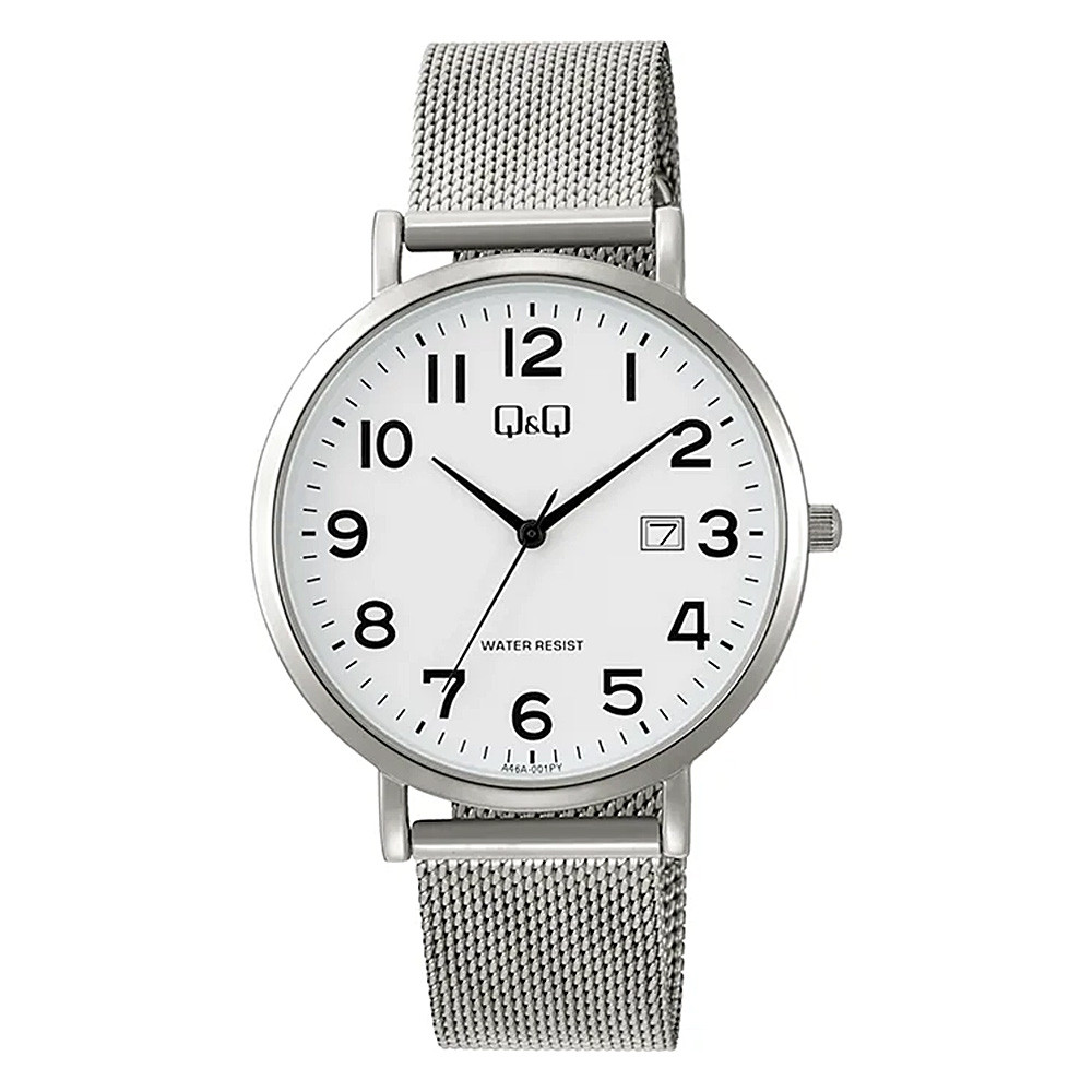 Q&Q karóra férfi, quartz, ezüst színű fémtok, ezüst színű acél csat (mesh band), fehér számlap A46A-001PY