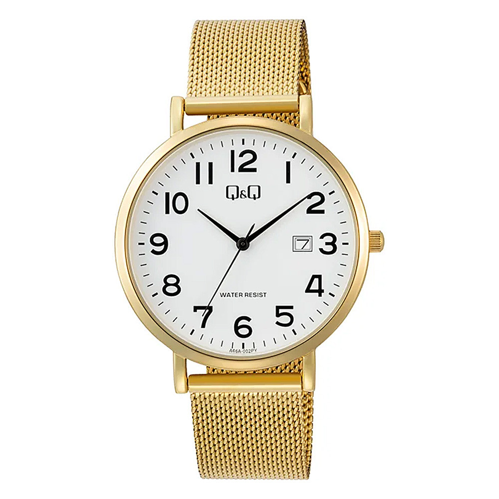 Q&Q férfi karóra, quartz, arany színű fém tok, arany színű acél csat (mesh band), fehér számlap A46A-002PY