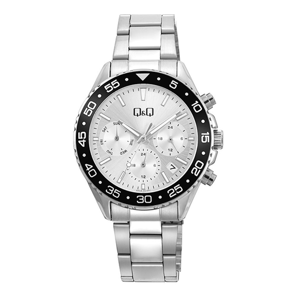 Q&Q Multifunkciós Női Karóra – Ezüst Színű Fémtokkal, Fekete Lünettával és Nemesacél Csattal