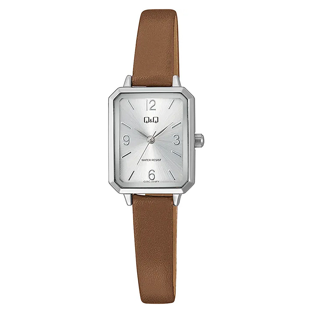 Q&Q női karóra, quartz, ezüst színű fémtok, barna színű bőrszíj, ezüst számlap, Q29C-004PY