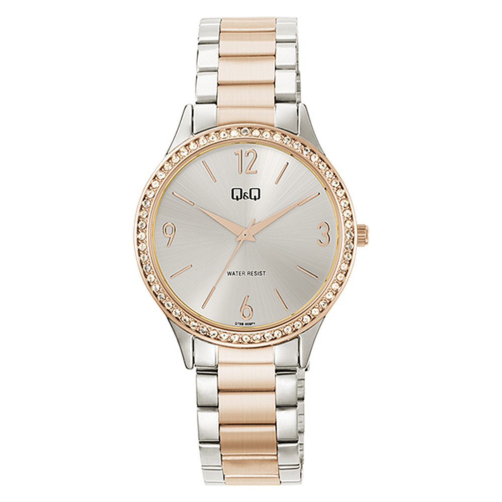 Q&Q Elegáns Bicolor Női Karóra – Köves Lünettával, Rose Gold Díszítéssel és Ezüst Számlappal