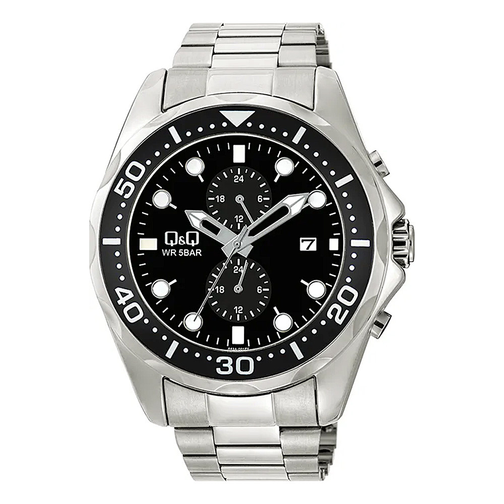 Q&Q Klasszikus Férfi Karóra – Ezüst Színű Tokkal, Fekete Búvár Lünettával és Többfunkciós Számlappal