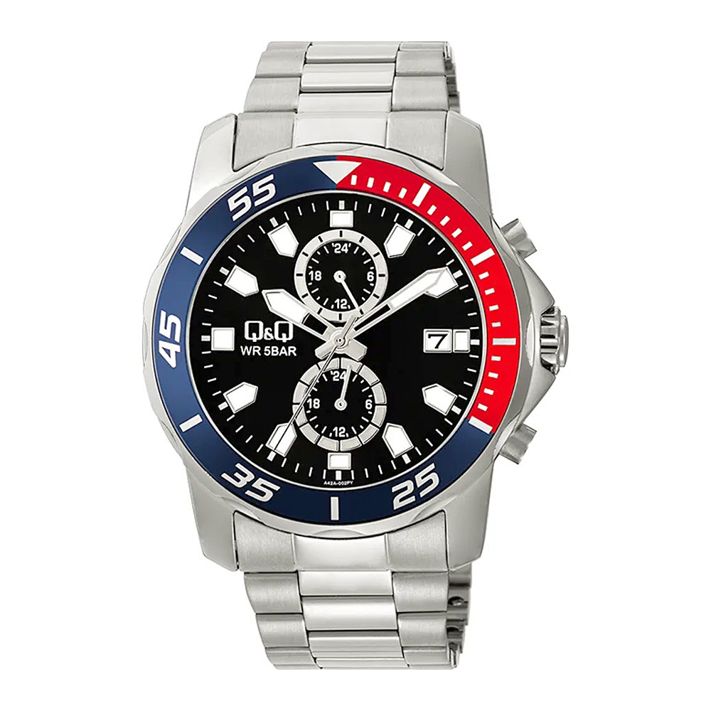 Q&Q férfi karóra, quartz, ezüst színű fémtok, ezüst színű fémcsat, fekete színű számlap A42A-002PY