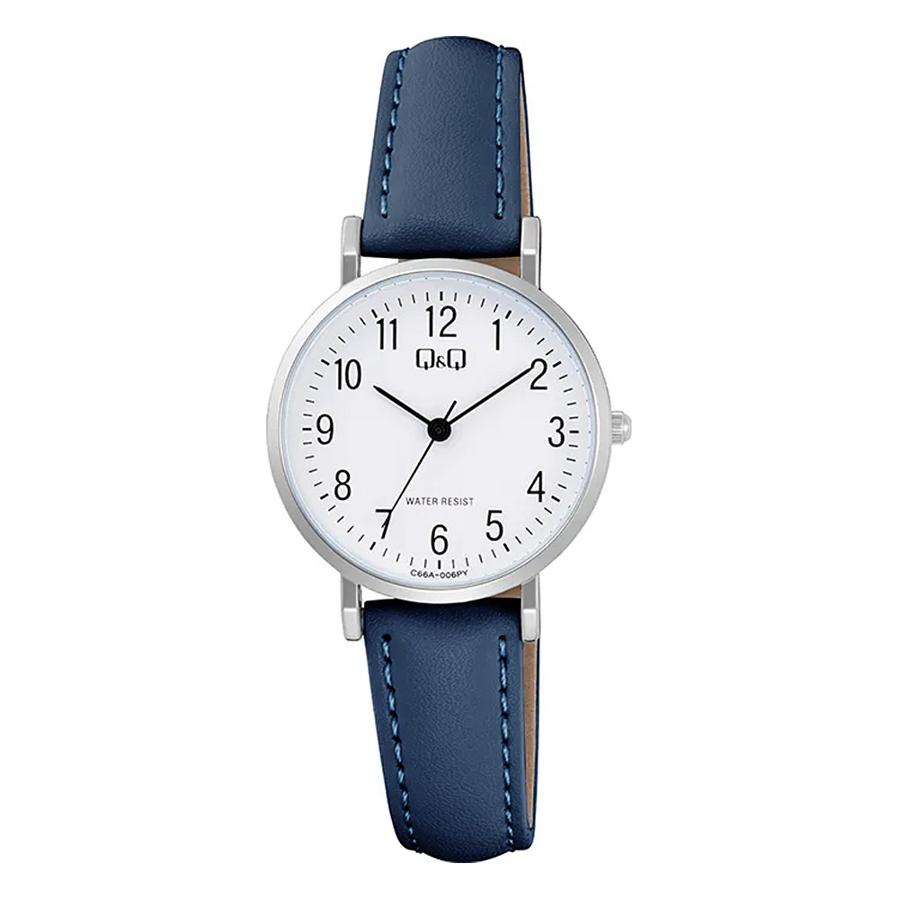 Q&Q női karóra, quartz, ezüst színű fémtok, kék színű bőrszíj, fehér színű számlap C66A-006PY