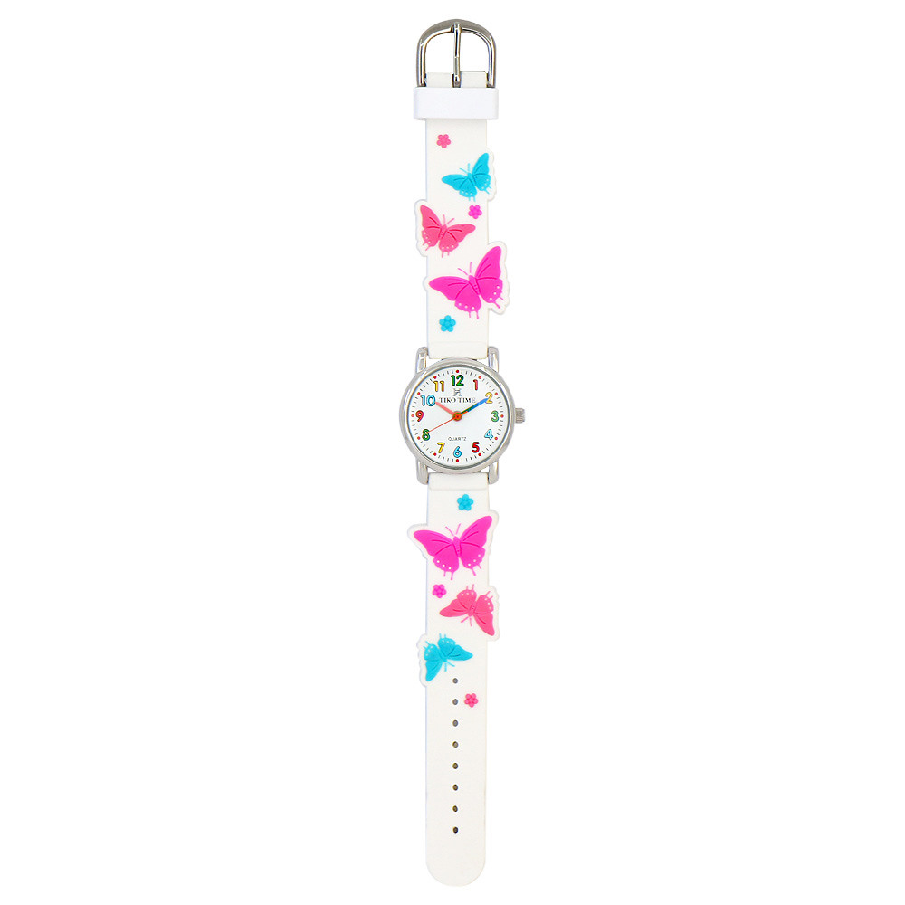 Tiko Time karóra gyerekeknek, ezüst színű fémtok, quartz szerkezet, 3D figurás fehér színű műanyag szíj, fehér arab színű számlap, cseppmentes vízállóság (pillangós)