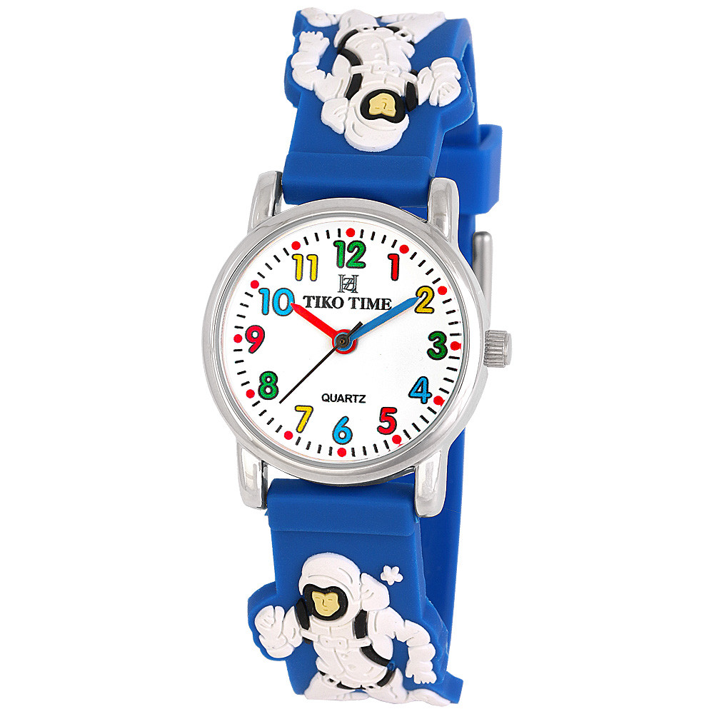 Tiko Time karóra gyerekeknek, ezüst színű fémtok, quartz szerkezet, fehér arab színű számlap, 3D figurás kék színű műanyag szíj, cseppmentes vízállóság (űrhajós)