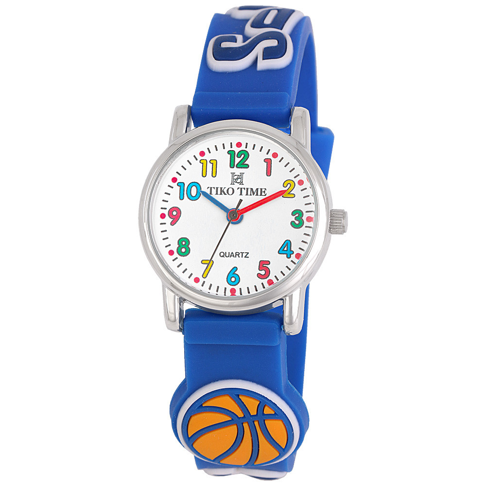 Tiko Time karóra gyerekeknek, ezüst színű fémtok, quartz szerkezet, fehér arab színű számlap, 3D figurás kék színű műanyag szíj, cseppmentes vízállóság (kosárlabdás)