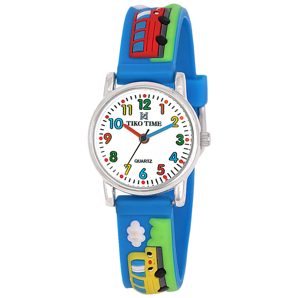 Tiko Time karóra gyerekeknek, ezüst színű fémtok, quartz szerkezet, fehér arab színű számlap, 3D figurás kék színű műanyag szíj, cseppmentes vízállóság (buszos)