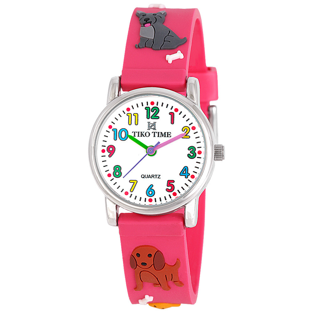 Tiko Time karóra gyerekeknek, ezüst színű fémtok, quartz szerkezet, fehér arab színű számlap, 3D figurás ciklámen műanyag szíj, cseppmentes vízállóság (kutyás)