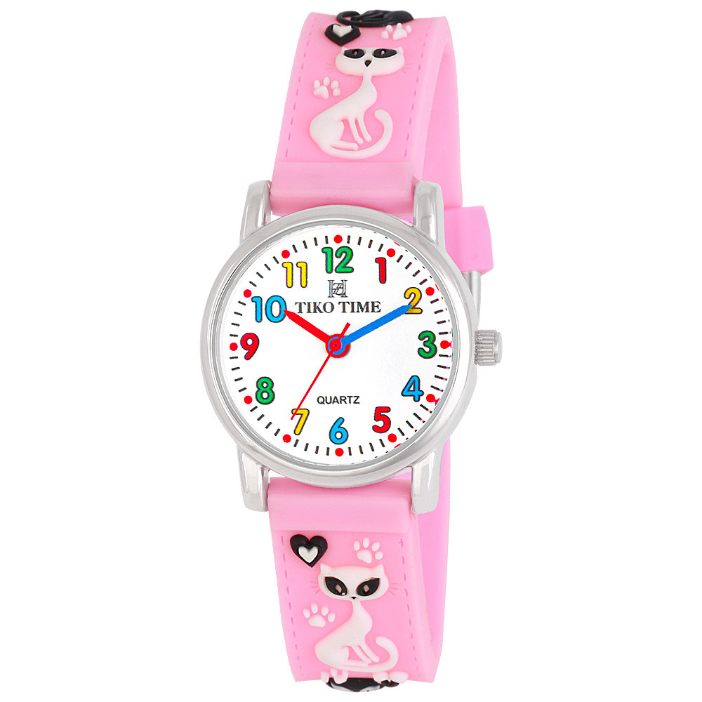 Tiko Time karóra gyerekeknek, ezüst színű fémtok, quartz szerkezet, fehér arab színű számlap, 3D figurás rózsaszín műanyag szíj, cseppmentes vízállóság (cicás)