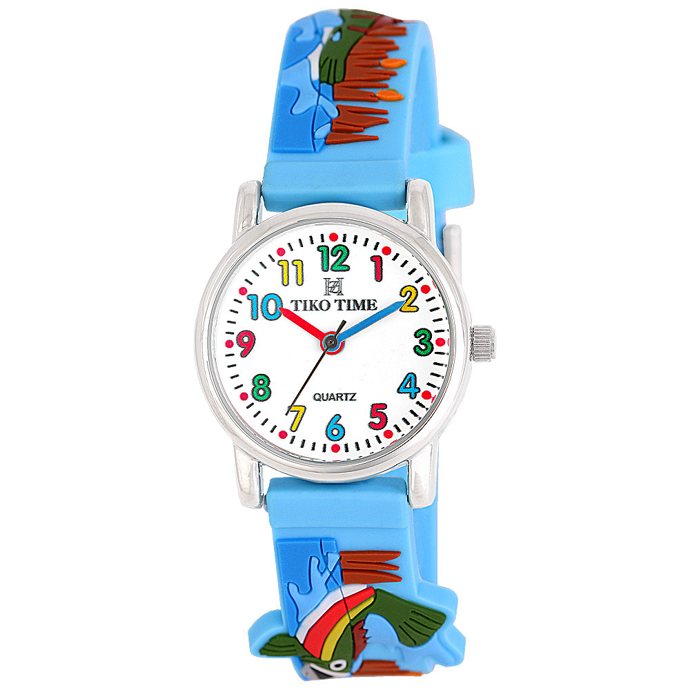 Tiko Time karóra gyerekeknek, ezüst színű fémtok, quartz szerkezet, fehér arab színű számlap, 3D figurás világos kék színű műanyag szíj, cseppmentes vízállóság (horgászos)