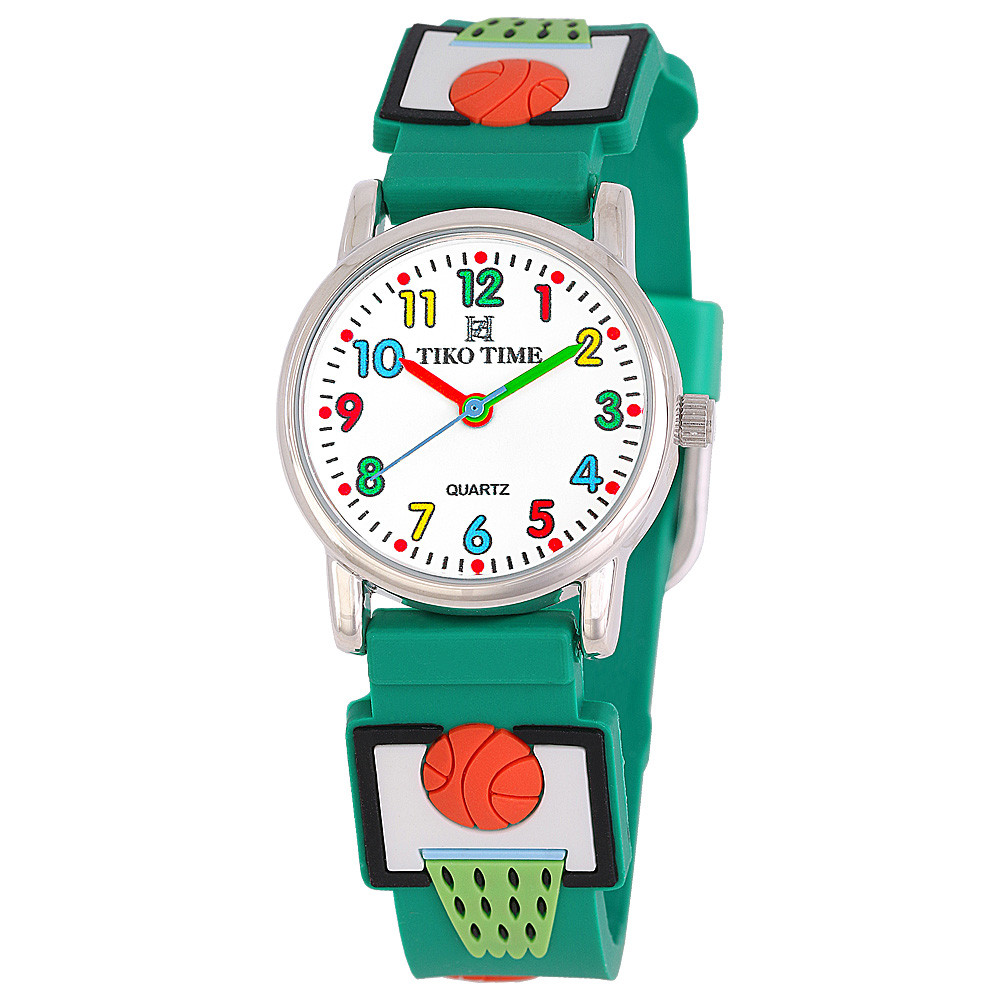 Tiko Time karóra gyerekeknek, ezüst színű fémtok, quartz szerkezet, fehér arab színű számlap, 3D figurás sötét zöld színű műanyag szíj, cseppmentes vízállóság (kosárlabdás)