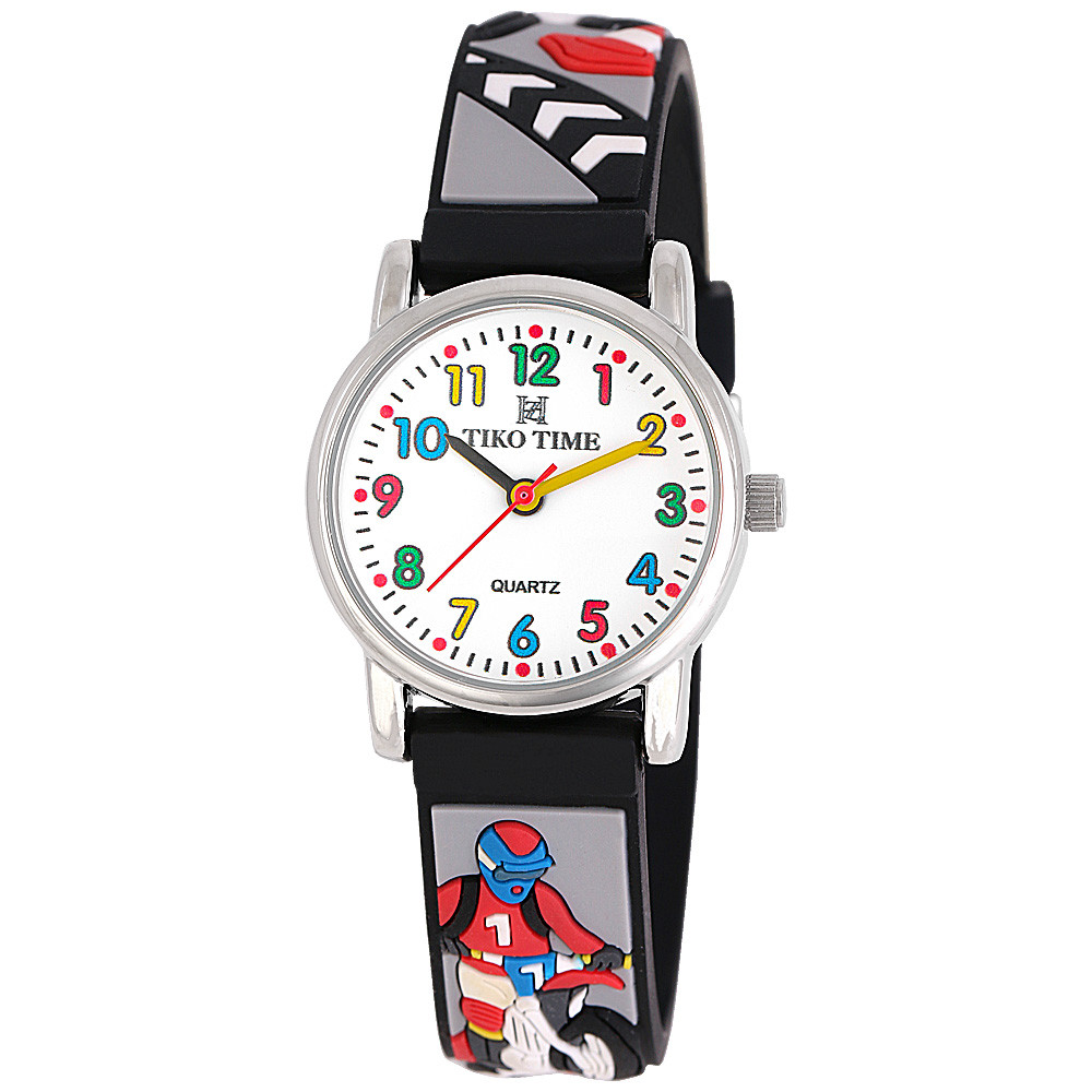Tiko Time karóra gyerekeknek, ezüst színű fémtok, quartz szerkezet, fehér arab színű számlap, 3D figurás fekete műanyag szíj, cseppmentes vízállóság (cross motoros)