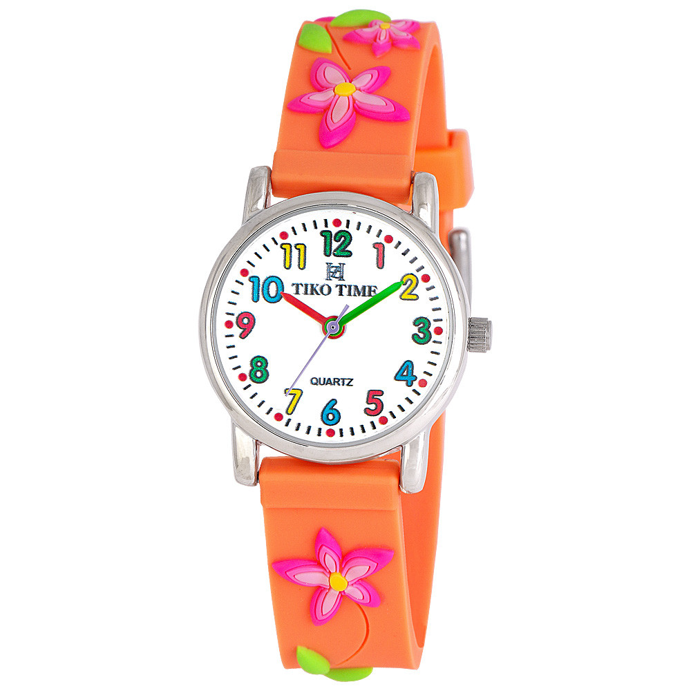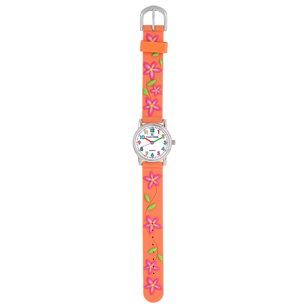 Tiko Time karóra gyerekeknek, ezüst színű fémtok, quartz szerkezet, fehér arab színű számlap, 3D figurás narancssárga színű műanyag szíj, cseppmentes vízállóság (virágos)