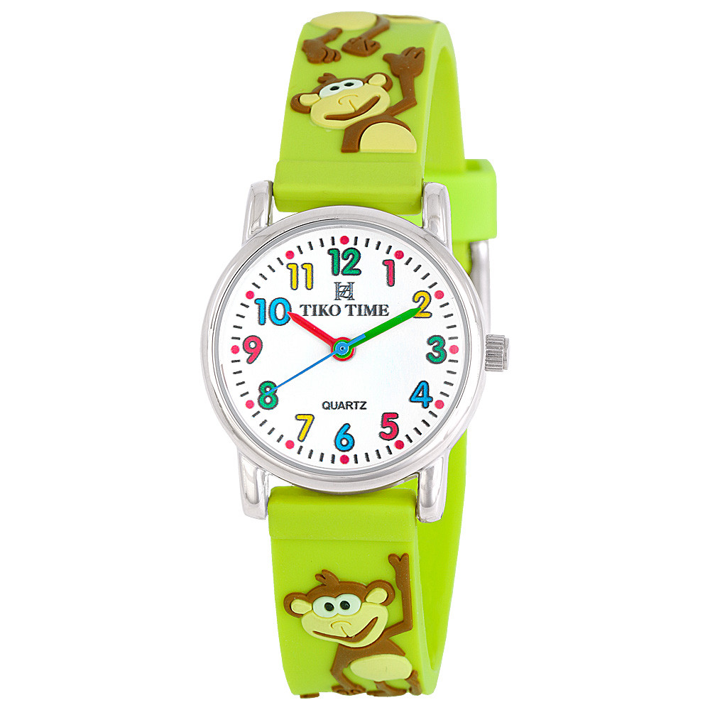 Tiko Time karóra gyerekeknek, ezüst színű fémtok, quartz szerkezet, fehér arab színű számlap, 3D figurás világoszöld színű műanyag szíj, cseppmentes vízállóság (majmos)