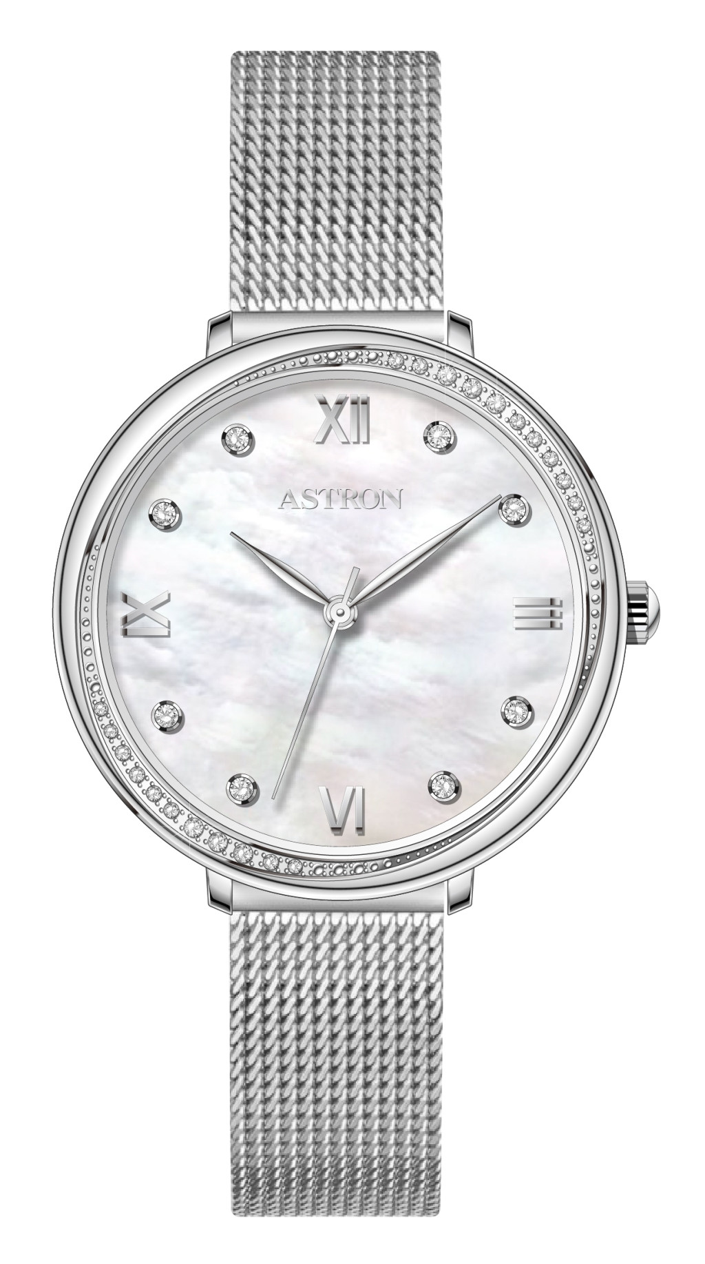 ASTRON 8065-7 női karóra, ezüst színű nemesacél tok, ezüst színű milánói csat, fehér számlap, keményített ásványüveg, quartz szerkezet, WR 50M vízállóság